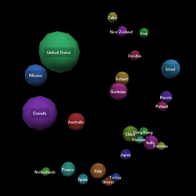 Physical distances are not the same as psychological distances. Physical distances are easy enough to measure, but how do we go about measuring psychological distances? The Mapped Web does this by taking the chance that given a page contains the name of one country it will also contain the name of another country as a measure for psychological distance. The resulting images show us how close countries are to each other in psychological terms.