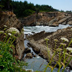 Wir fuhren von Bandon die kleine „Seven Devils Rd.“ entlang der Küste. Eine wunderschöne Strasse die nur zur Hälfte geteert ist aber problemlos zu fahren. Besuchenswert sind die Ausblicke „Whiskey Run“ und „Seven Devils State Park“. In Charleston sind wir links abgebogen auf den „Cape Arago Hwy“ und haben „Sunset State Park“ und „Simpson Reef“ besucht. Speziell der botanische Garten bei Simpson Reef ist sehenswert.
